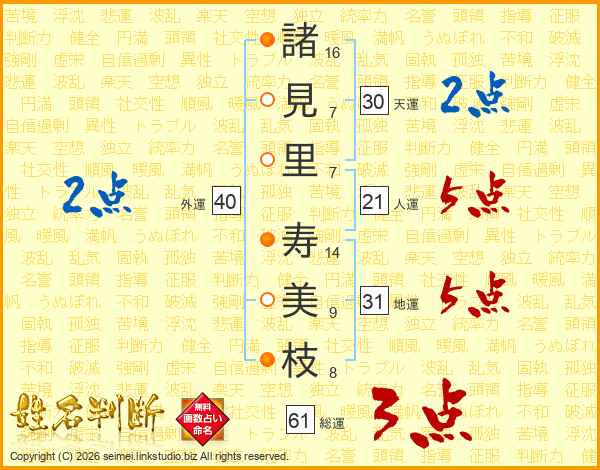 諸(16画)見(7画)里(7画) 寿(14画)美(9画)枝(8画)