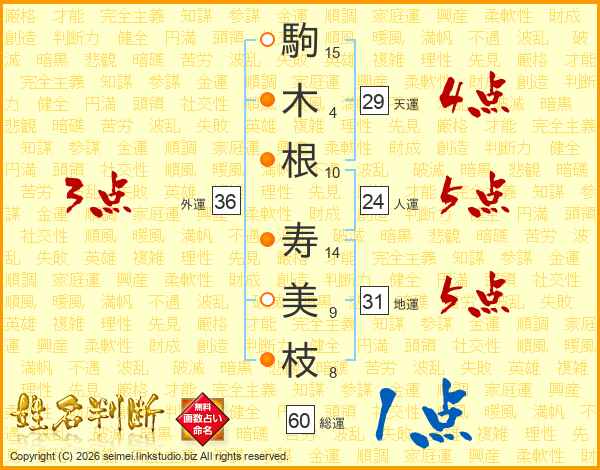 駒(15画)木(4画)根(10画) 寿(14画)美(9画)枝(8画)
