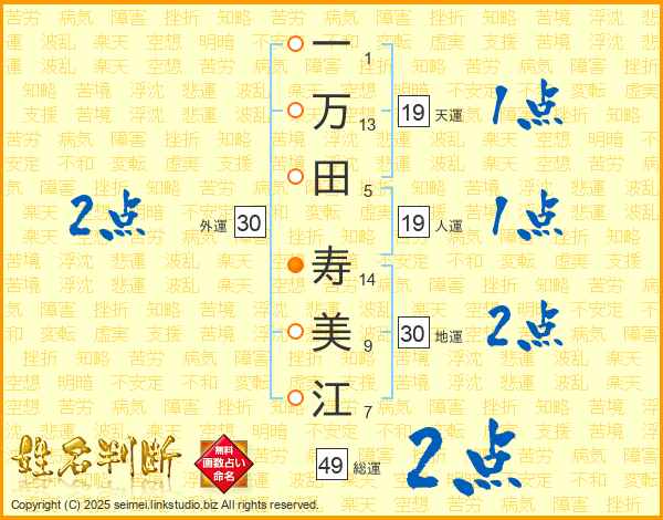 一(1画)万(13画)田(5画) 寿(14画)美(9画)江(7画)