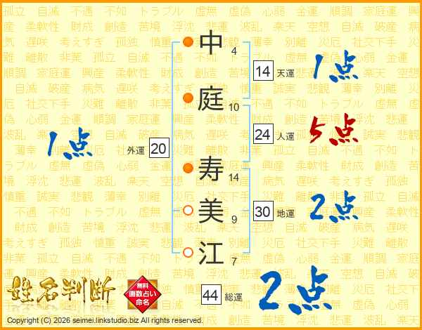 中(4画)庭(10画) 寿(14画)美(9画)江(7画)
