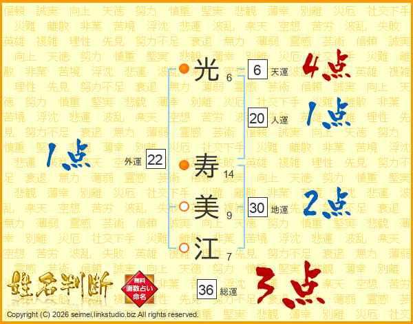 画数の奇数(○陽)と偶数(●陰)の配列で吉凶を占います。どちらかにかたよる名前は大凶名で避ける必要があります。画数の奇数偶数。