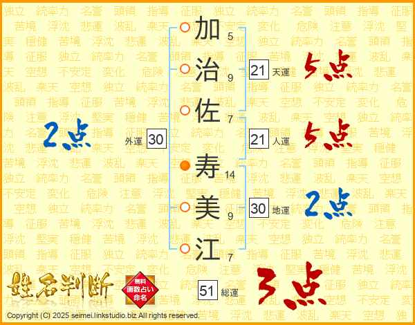 加(5画)治(9画)佐(7画) 寿(14画)美(9画)江(7画)