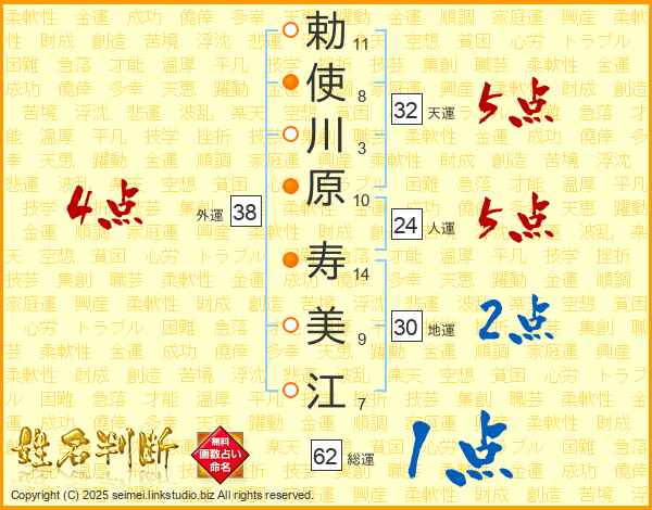 勅(11画)使(8画)川(3画)原(10画) 寿(14画)美(9画)江(7画)