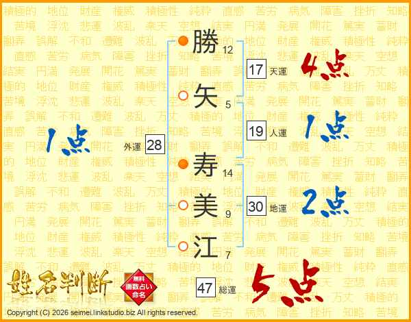 勝(12画)矢(5画) 寿(14画)美(9画)江(7画)