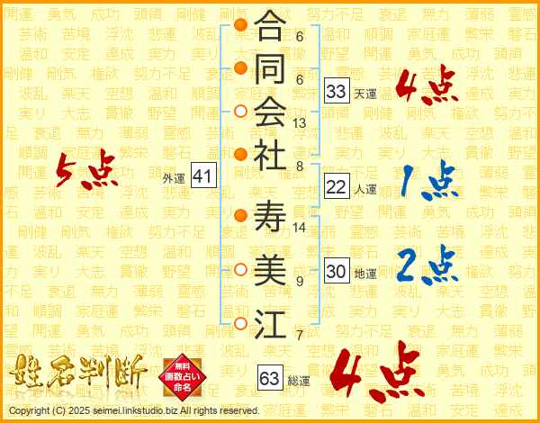 合(6画)同(6画)会(13画)社(8画) 寿(14画)美(9画)江(7画)