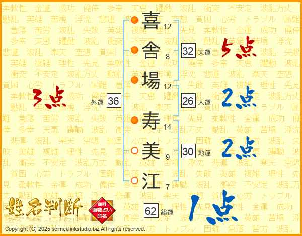 喜(12画)舎(8画)場(12画) 寿(14画)美(9画)江(7画)