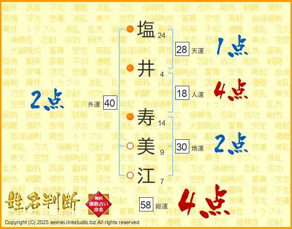 塩(24画)井(4画) 寿(14画)美(9画)江(7画)