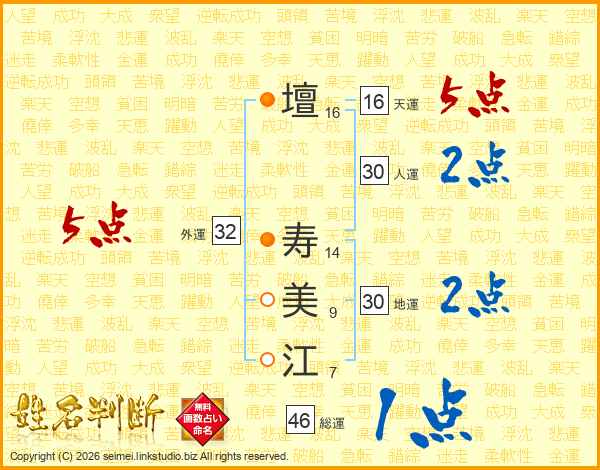 あなたの人生を表す1番重要な運勢です。生涯を通じて影響する総合運となり、主に50歳以降の晩年期に影響を及ぼします。苗字と名前の合計画数。