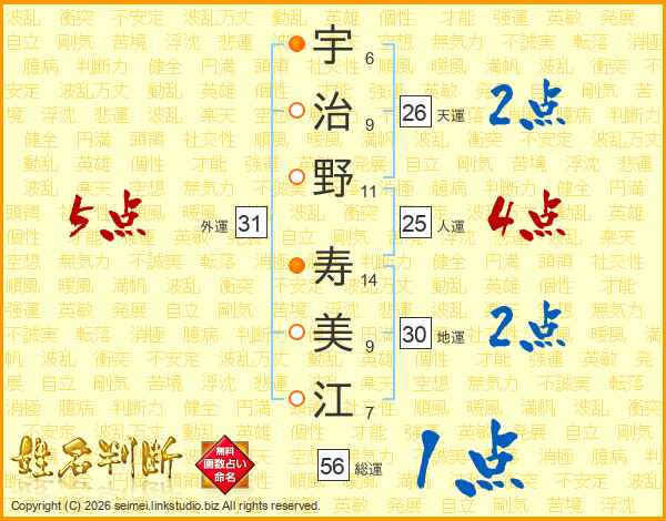 宇(6画)治(9画)野(11画) 寿(14画)美(9画)江(7画)