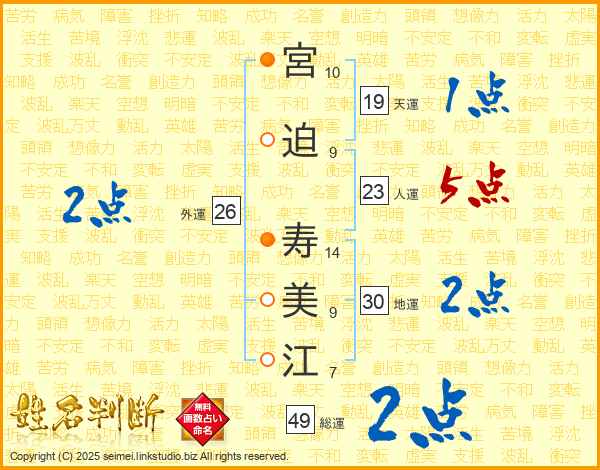 宮(10画)迫(9画) 寿(14画)美(9画)江(7画)