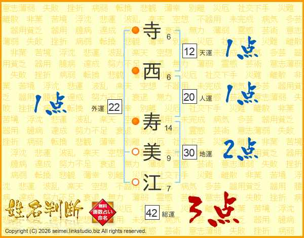 寺(6画)西(6画) 寿(14画)美(9画)江(7画)