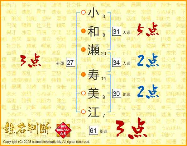 小(3画)和(8画)瀬(20画) 寿(14画)美(9画)江(7画)