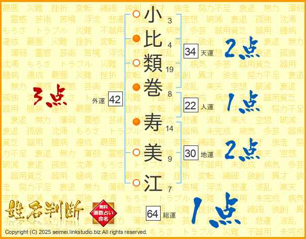 小(3画)比(4画)類(19画)巻(8画) 寿(14画)美(9画)江(7画)