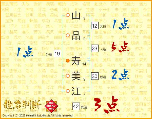 山(3画)品(9画) 寿(14画)美(9画)江(7画)