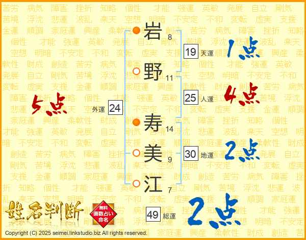 岩(8画)野(11画) 寿(14画)美(9画)江(7画)