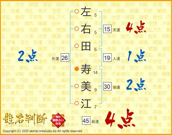 左(5画)右(5画)田(5画) 寿(14画)美(9画)江(7画)
