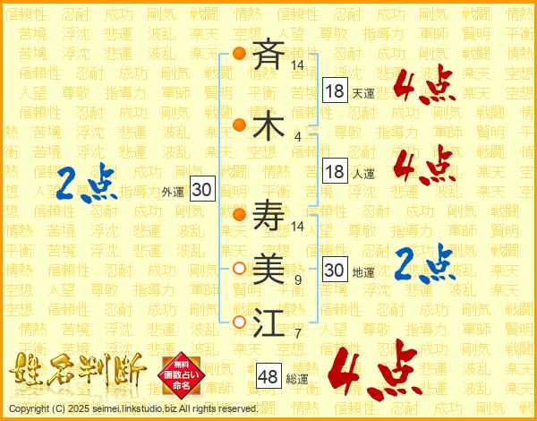 斉(14画)木(4画) 寿(14画)美(9画)江(7画)