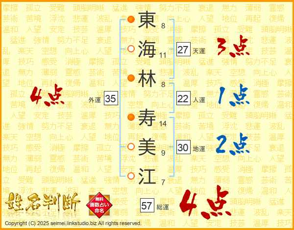 東(8画)海(11画)林(8画) 寿(14画)美(9画)江(7画)