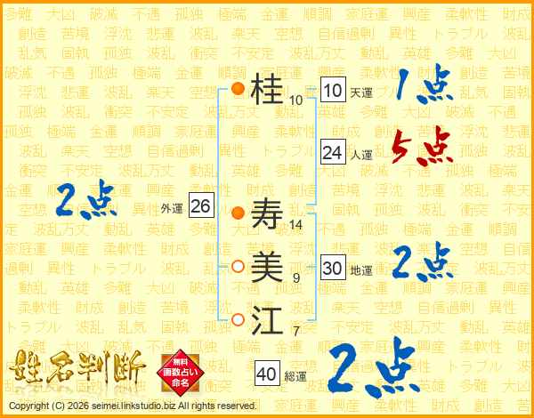 画数の奇数(○陽)と偶数(●陰)の配列で吉凶を占います。どちらかにかたよる名前は大凶名で避ける必要があります。画数の奇数偶数。