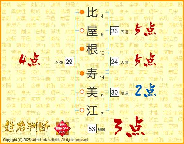 比(4画)屋(9画)根(10画) 寿(14画)美(9画)江(7画)