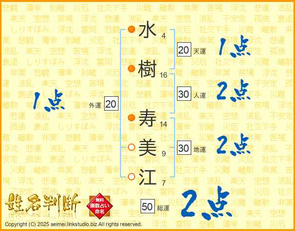 水(4画)樹(16画) 寿(14画)美(9画)江(7画)