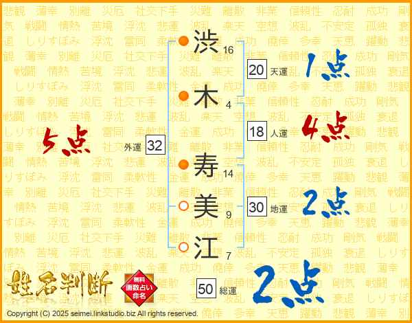 渋(16画)木(4画) 寿(14画)美(9画)江(7画)