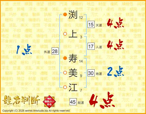 渕(12画)上(3画) 寿(14画)美(9画)江(7画)
