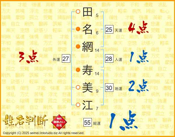 田(5画)名(6画)網(14画) 寿(14画)美(9画)江(7画)