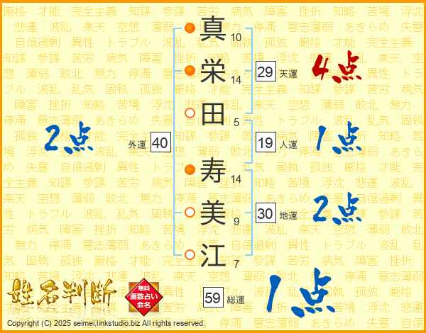 真(10画)栄(14画)田(5画) 寿(14画)美(9画)江(7画)