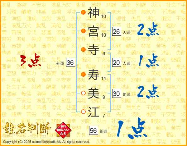 神(10画)宮(10画)寺(6画) 寿(14画)美(9画)江(7画)
