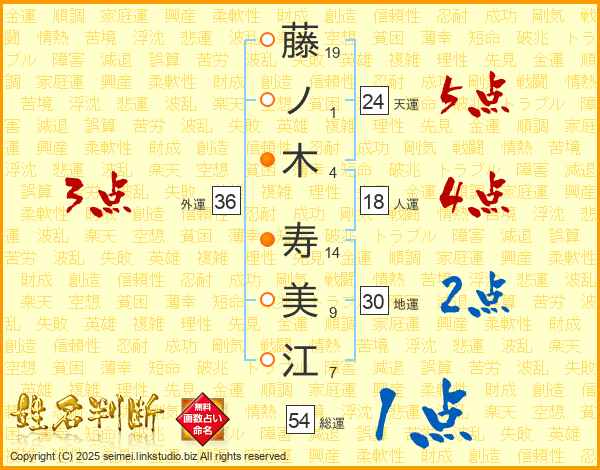 藤(19画)ノ(1画)木(4画) 寿(14画)美(9画)江(7画)