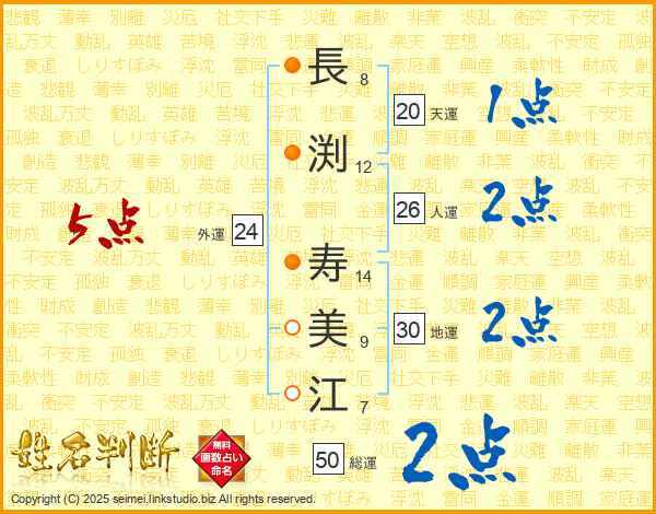 長(8画)渕(12画) 寿(14画)美(9画)江(7画)