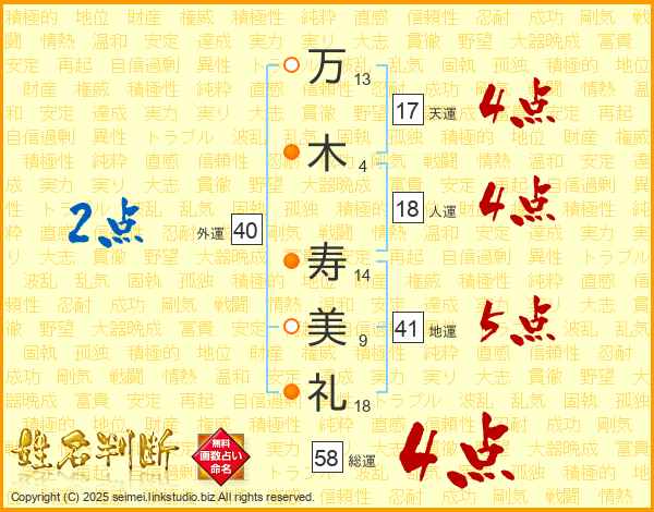 万(13画)木(4画) 寿(14画)美(9画)礼(18画)
