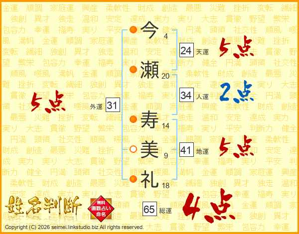 今(4画)瀬(20画) 寿(14画)美(9画)礼(18画)
