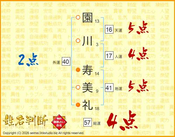 園(13画)川(3画) 寿(14画)美(9画)礼(18画)