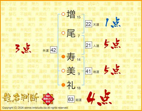 増(15画)尾(7画) 寿(14画)美(9画)礼(18画)