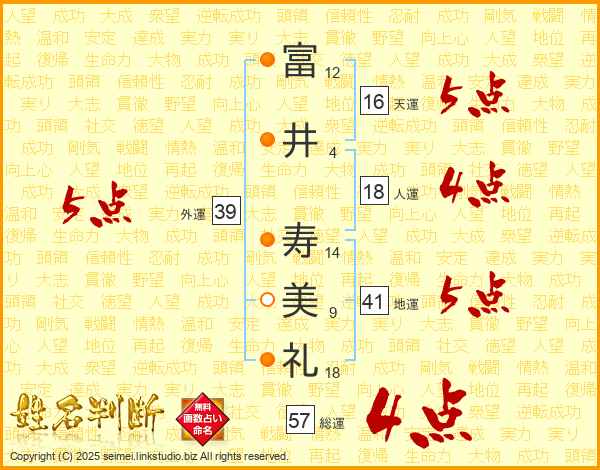 富(12画)井(4画) 寿(14画)美(9画)礼(18画)