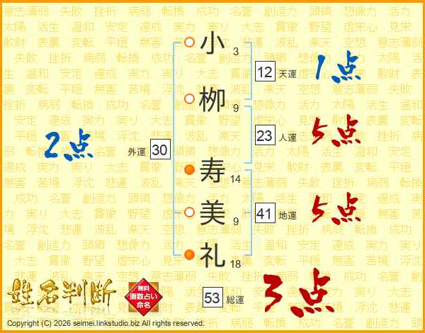 小(3画)栁(9画) 寿(14画)美(9画)礼(18画)