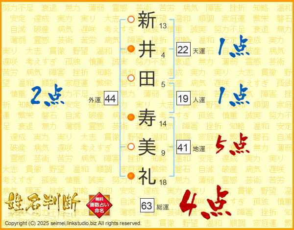 新(13画)井(4画)田(5画) 寿(14画)美(9画)礼(18画)