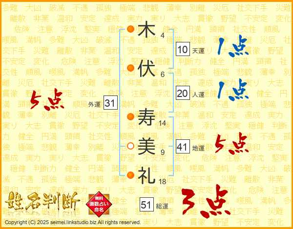木(4画)伏(6画) 寿(14画)美(9画)礼(18画)