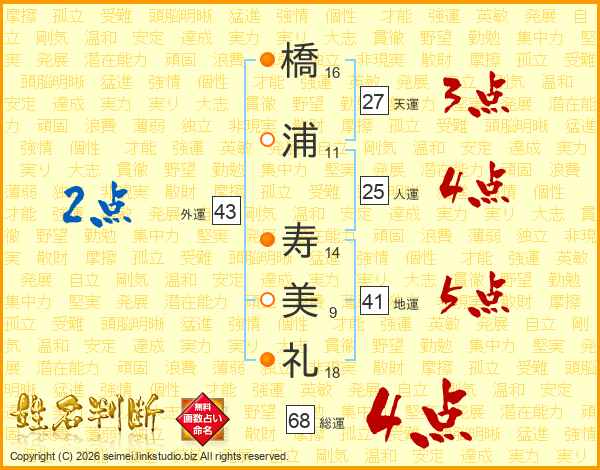 橋(16画)浦(11画) 寿(14画)美(9画)礼(18画)