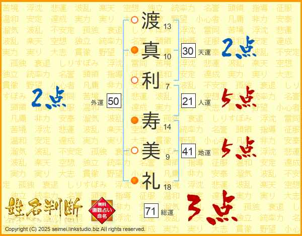 渡(13画)真(10画)利(7画) 寿(14画)美(9画)礼(18画)