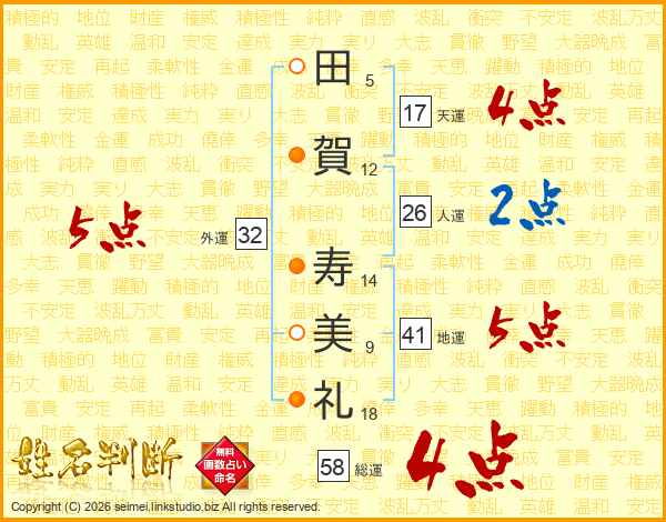 田(5画)賀(12画) 寿(14画)美(9画)礼(18画)