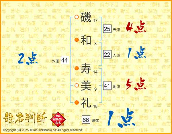 磯(17画)和(8画) 寿(14画)美(9画)礼(18画)