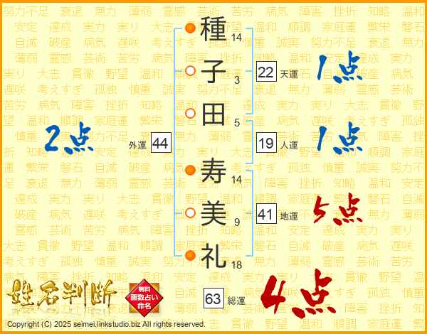 種(14画)子(3画)田(5画) 寿(14画)美(9画)礼(18画)