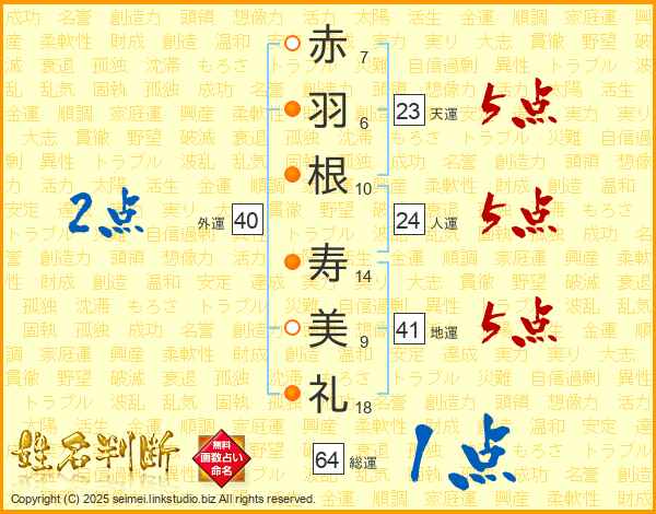 赤(7画)羽(6画)根(10画) 寿(14画)美(9画)礼(18画)