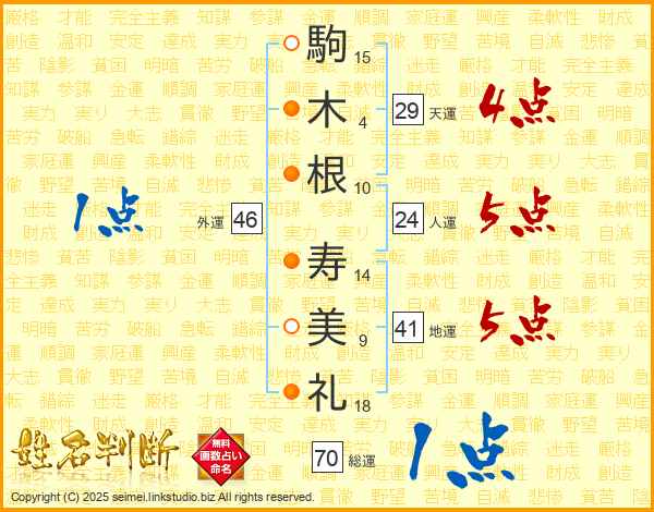 駒(15画)木(4画)根(10画) 寿(14画)美(9画)礼(18画)