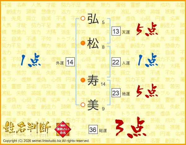 あなたの人生を表す1番重要な運勢です。生涯を通じて影響する総合運となり、主に50歳以降の晩年期に影響を及ぼします。苗字と名前の合計画数。