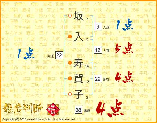 坂(7画)入(2画) 寿(14画)賀(12画)子(3画)