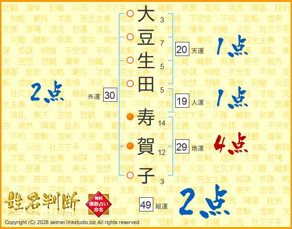 大(3画)豆(7画)生(5画)田(5画) 寿(14画)賀(12画)子(3画)
